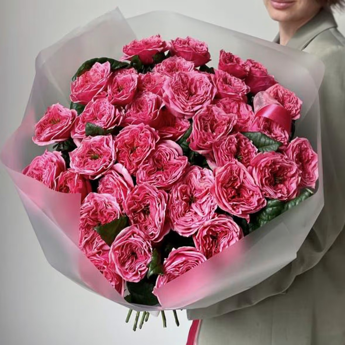 This bouquet of fresh garden roses, elegantly wrapped in matte film and tied with a ribbon, is perfect for adding a touch of romance or showing appreciation. With a soft pink hue, these roses bring a sense of grace to any occasion, making it an ideal choice for heartfelt gestures and expressions of love.
